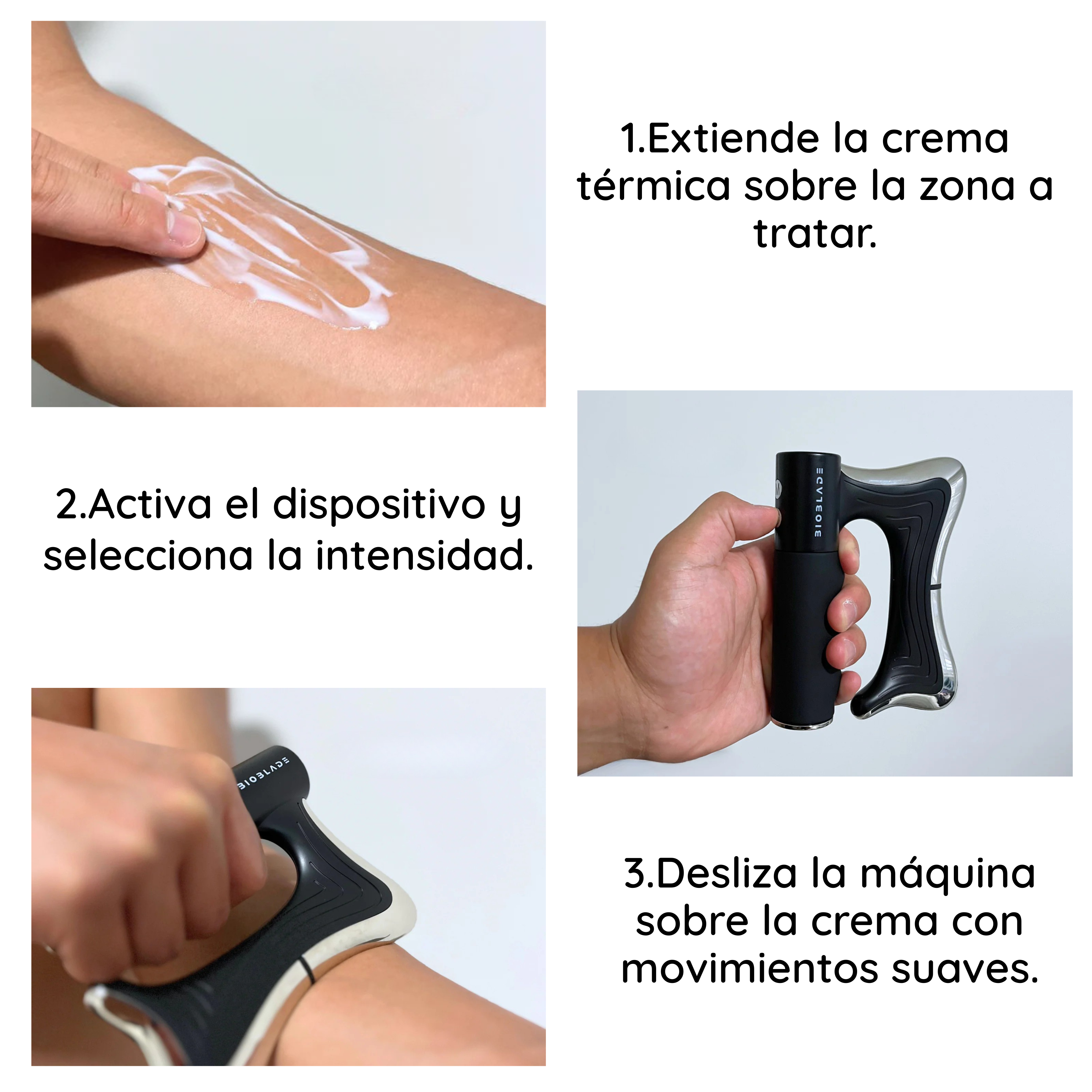 Favorece el flujo sanguíneo en la zona tratada, ayudando a eliminar toxinas, reducir la rigidez muscular y mejorar la sensación de ligereza tras cada uso.